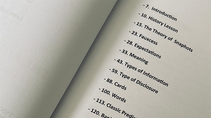 "In my opinion, what truly matters in mentalism is the ability to create unforgettable memories, images, and stories that your audience will remember forever. I believe it is a true art to be able to do this, and this book is all about that! I have spent the last six years researching and experimenting with my craft to find the right answer. This is a collection of ideas and principles that will inspire you and explain how to reveal information in a unique, engaging, and surprising way. I will share with you numerous routines that demonstrate how to apply these ideas."
