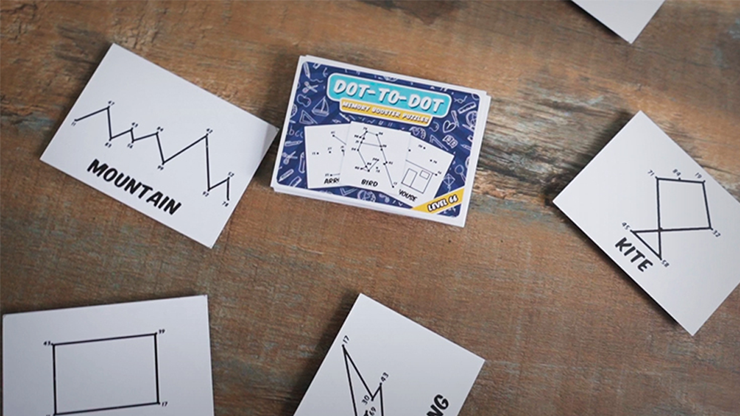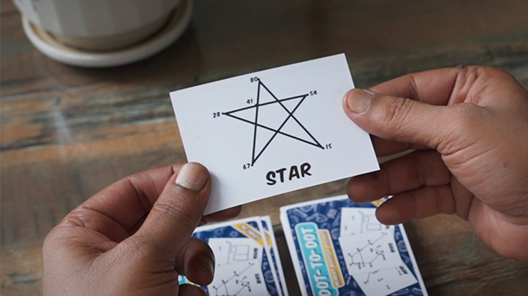 A spectator freely selects a card from a pack of dot-to-dot images. Each card contains a picture, created by joining a unique sequence of numbered dots. They select a card but keep the card face down - so the image and the number sequence remain a complete mystery. Nobody knows what they chose.