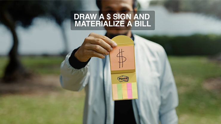 The magician draws in a post-it a piece a dollar sign, now he flicks the post-it pad and the written dollar sign transforms into real dollar bill. The perfect way to get instant cash!