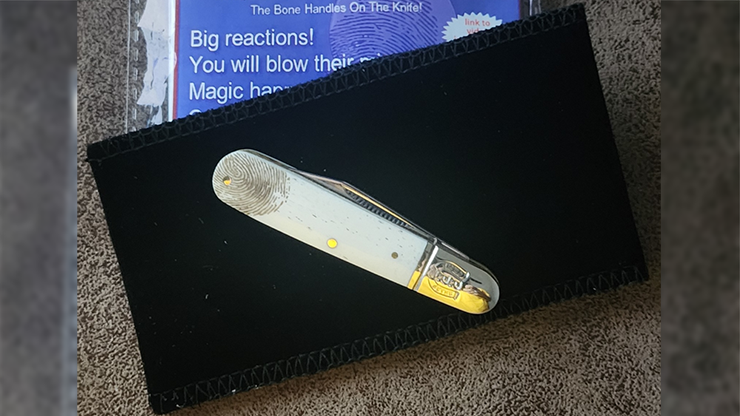 The spectator is given a small pocket knife to hold. They are ask to place it between their thumb and first finger. When their thumb is lifted away, their print is seen etched into the handle of the knife!