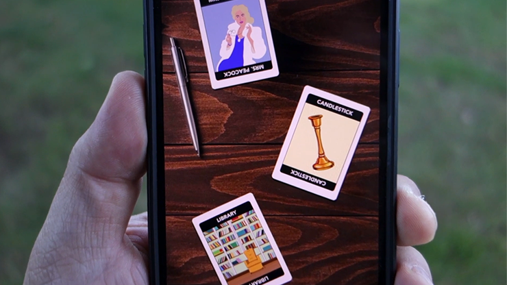 Clue: A suspect, weapon and location from a game of Clue are all freely named, and a photo taken on your phone shows the three game cards they selected!