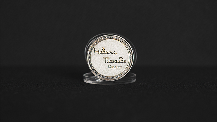 A souvenir coin from the famous Madame Tussauds Museum is shown and examined by the spectator.