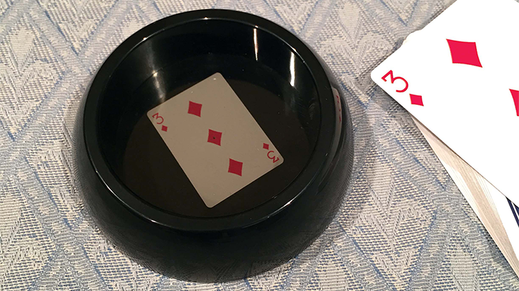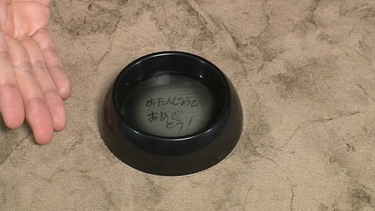 El mago vierte agua en un recipiente y le pide al espectador que se concentre en su carta mientras mira la superficie del agua.