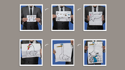 Each time you unfold the paper, it gets bigger and the illustration magically changes. Your audience will see the rabbit become a small dog, which will elongate into a dachshund, which will transform into a seal and then a chicken and finally a stork.