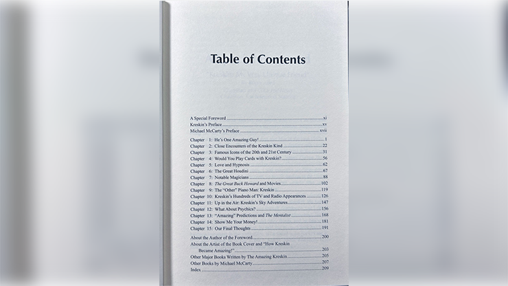 It is a collection of reminiscences, stories, and opinions he enjoyed sharing with friends. It is an entertaining read that reflects what it is like to be around The Amazing Kreskin. There are also many stories and reminiscences about magic and magicians with an extensive section about Houdini.