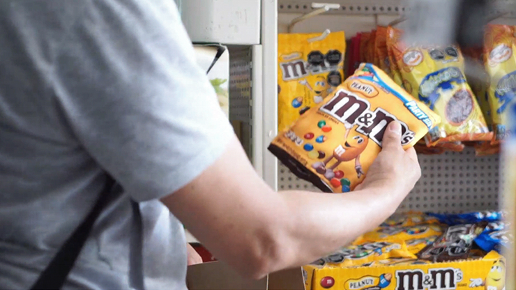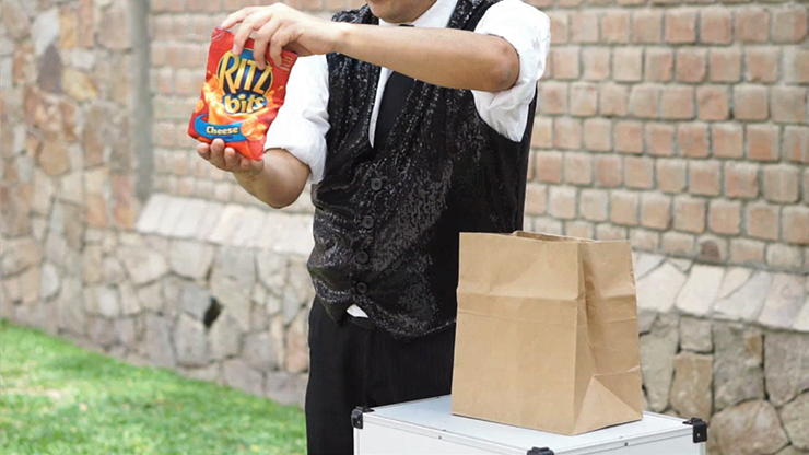 The magician begins to show the products that he has in the bag one by one (Ritz mini/Oreo mini/Snickers mini/M&M mini)