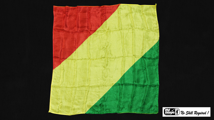 Three silk hankies are shown. One green, one red and one yellow. They are dropped into a bag and once removed, they are found to be tied to one another with knots. With a wave of your hand, make the knots disappear, only to show that the three silks have now combined into one tri-colored silk!
