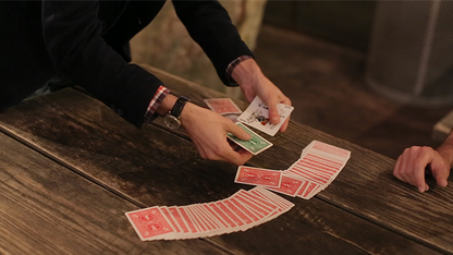 A red card is selected and placed between the jokers. In an instant with no moves, the selection vanishes and reappears face up in the deck. It is placed once more in between the jokers and with a wave of the hand, the back changes color.