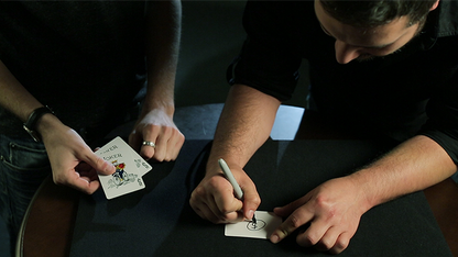 An unknown card is place between the two jokers. A card is chosen and signed then lost in the deck. The jokers are picked up and the card between them is shown to be the signed selection.